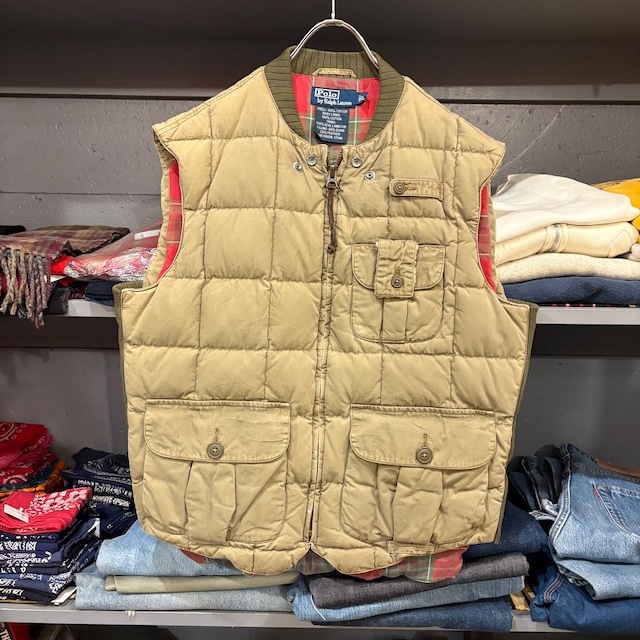 ポロバイラルフローレン ダウンベスト マルチポケット TALONジッパー 脇下がリブになっています 裏地フランネルのチェック柄 首元のスナップでシルエットを変えられます フロントに数箇所スレ、汚れあり ボディ:コットン100% フィル:ダウン80% フェザー20% カラー:カーキ サイズ表記: L 実寸(約cm) 肩幅:48 身幅:60 袖丈:- 着丈:68 B1097