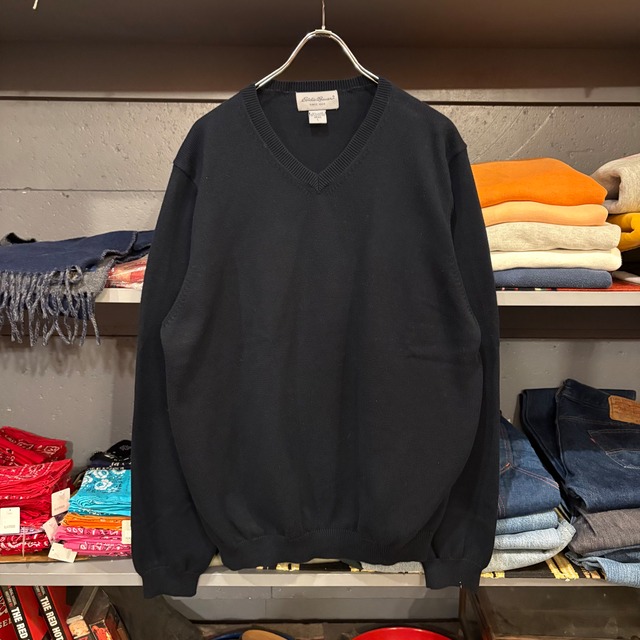 1990年代 エディーバウアー コットンニットセーター Vネック カラー:ブラック コットン:91% ナイロン:9% サイズ表記:L 実寸(約cm) 肩幅:51 身幅:59 袖丈:66 着丈:69 B729