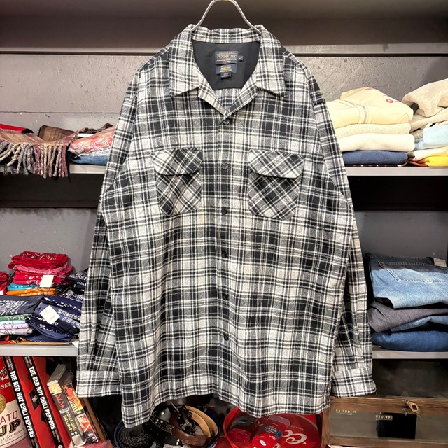 ペンドルトン オープンカラーウールシャツ 開襟 ボックス 両胸フラップ フロントに汚れあり メキシコ製 カラー:ブラック/ホワイト ウール 100% サイズ表記:TALL XL 実寸(cm) 肩幅:57 身幅:67.5 袖丈:69.5 着丈:84.5 B985