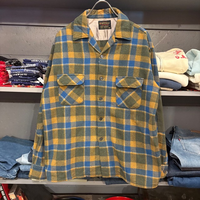 1960年代 KENTFIELD オープンカラー ロングスリーブ開襟シャツ チェックシャツ 開襟 ボックスシルエット 両胸フラップポケット エルボーパッチ フロント汚れあり ウール:95% ナイロン:5% カラー:イエロー/ブルー サイズ表記:L 16-16 1/2 実寸(約cm) 肩幅:52 身幅:63 袖丈:60 着丈:70 B965
