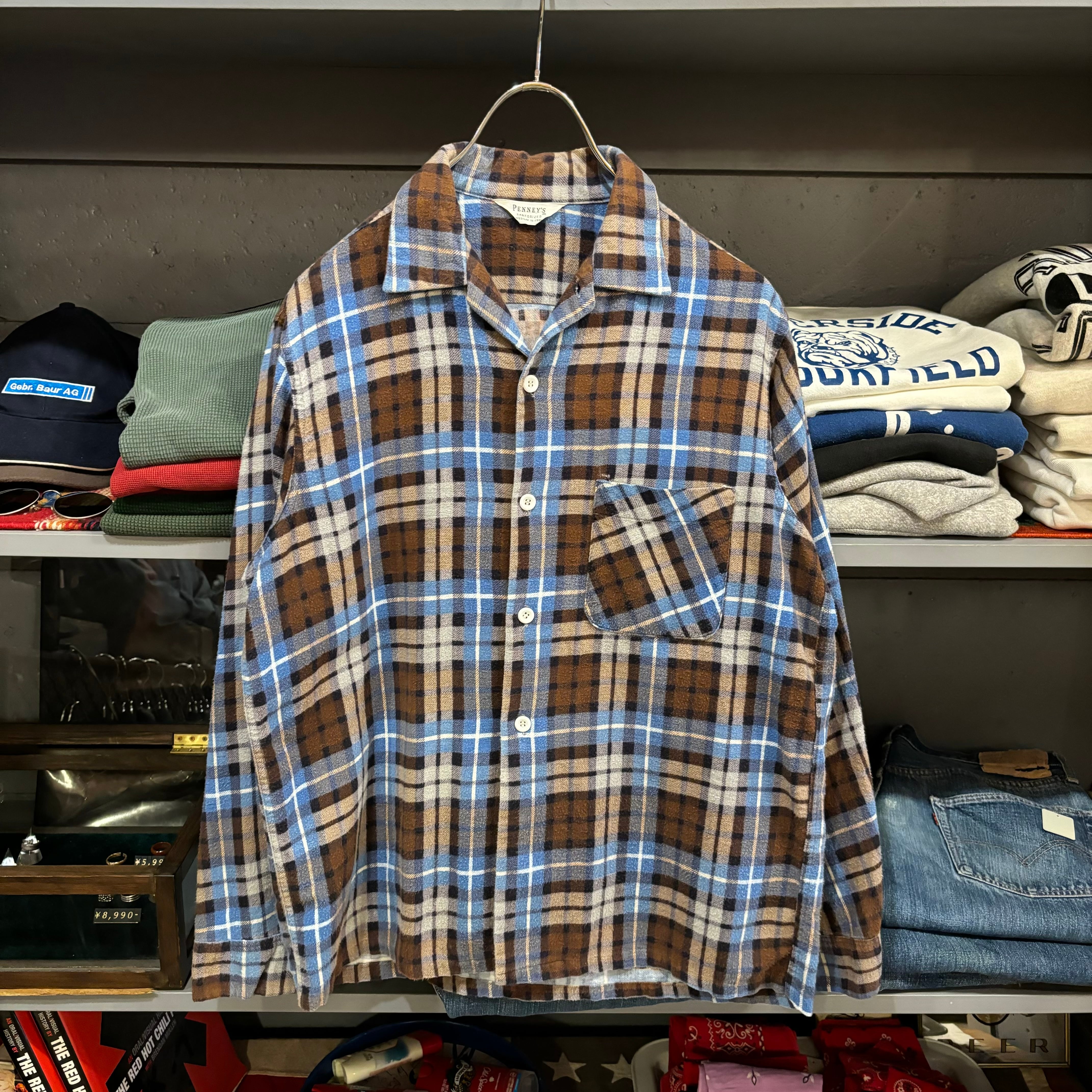 50s PENNEY'S L/S Open Collar Print Flannel Shirt